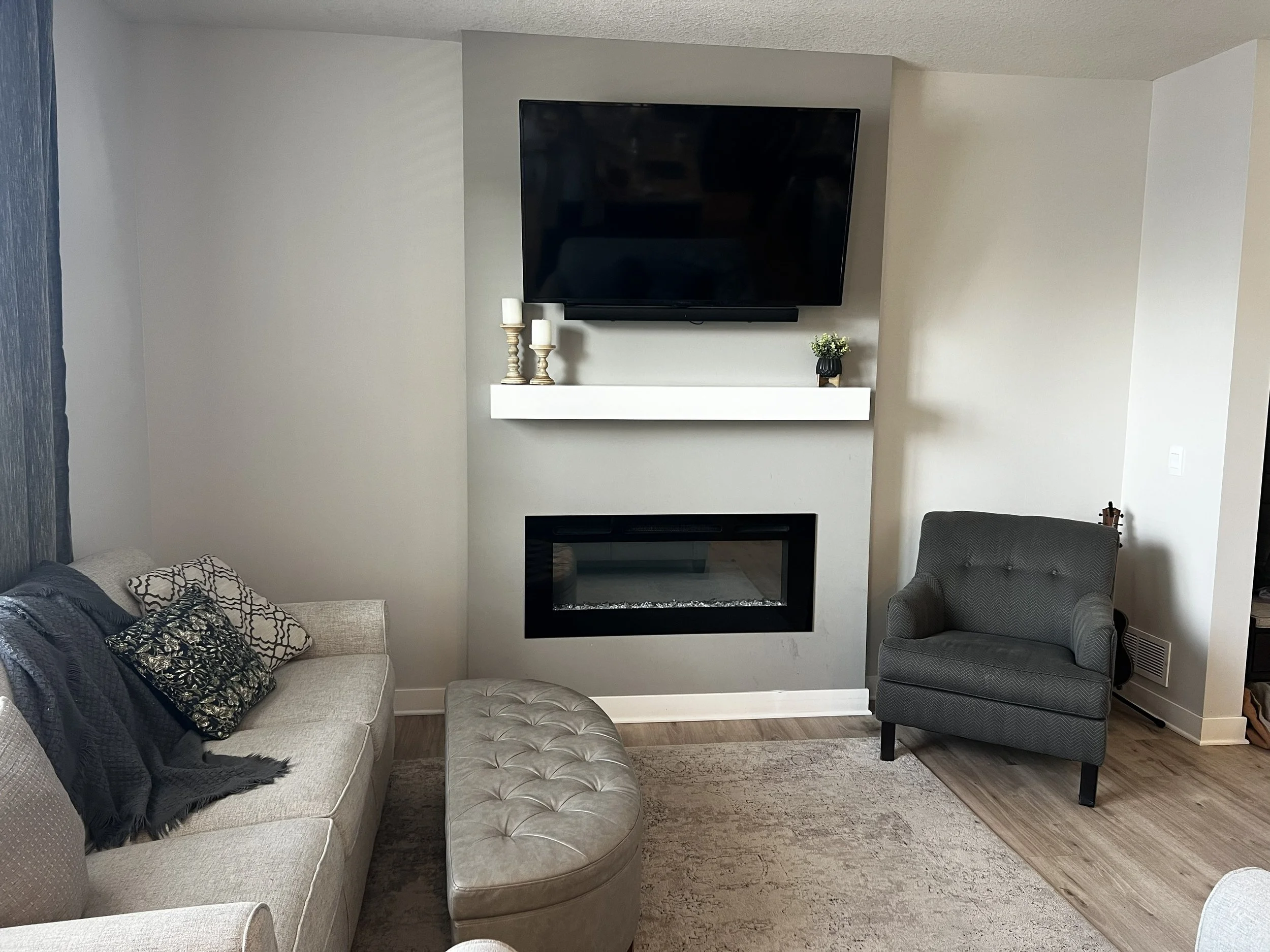 So after a few months of dreaming and lots of Pinterest boards, we decided to wrap the fireplace in a stone ledger board. We also knew we wanted more warm wood tones in our space, so we planned to upgrade the white mantle to a wood mantle and install floating shelves to match.